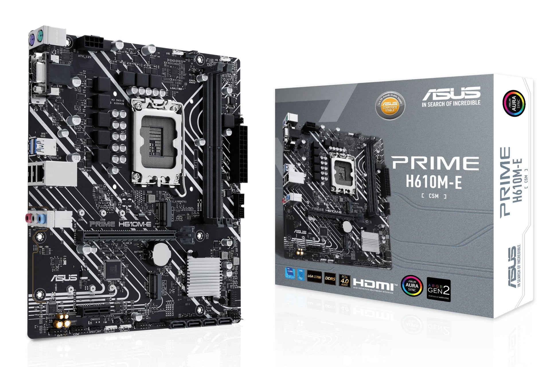 ASUS PRIME H610M-E-CSM. Processor manufacturer: Intel, Processor socket: LGA 1700, Compatible processors: Intel® Celeron®, Intel® Core™ i3, Intel® Core™ i5, Intel® Core™ i7, Intel® Core™ i9,.... Supported memory types: DDR5-SDRAM, Maximum supported RAM: 96 GB, Memory slots type: DIMM. Supported storage drive interfaces: M.2, SATA III, Supported storage drive types: HDD & SSD. Ethernet interface type: Gigabit Ethernet. Component for: PC, Motherboard form factor: micro ATX, Motherboard chipset family: Intel