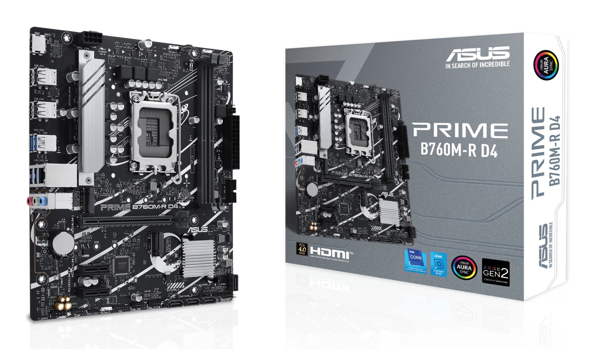 ASUS PRIME B760M-R D4. Processor manufacturer: Intel, Processor socket: LGA 1700, Compatible processors: 14th Gen Intel Core i9, 12th Gen Intel Core i3, 13th Gen Intel Core i3, 12th Gen Intel Core i5,.... Supported memory types: DDR4-SDRAM, Maximum supported RAM: 64 GB, Memory slots type: DIMM. Supported storage drive interfaces: M.2, SATA III, Supported storage drive types: HDD & SSD, RAID levels: 0, 1, 5, 10. Ethernet interface type: 2.5 Gigabit Ethernet. Component for: PC, Motherboard form factor: micro ATX, Motherboard chipset family: Intel