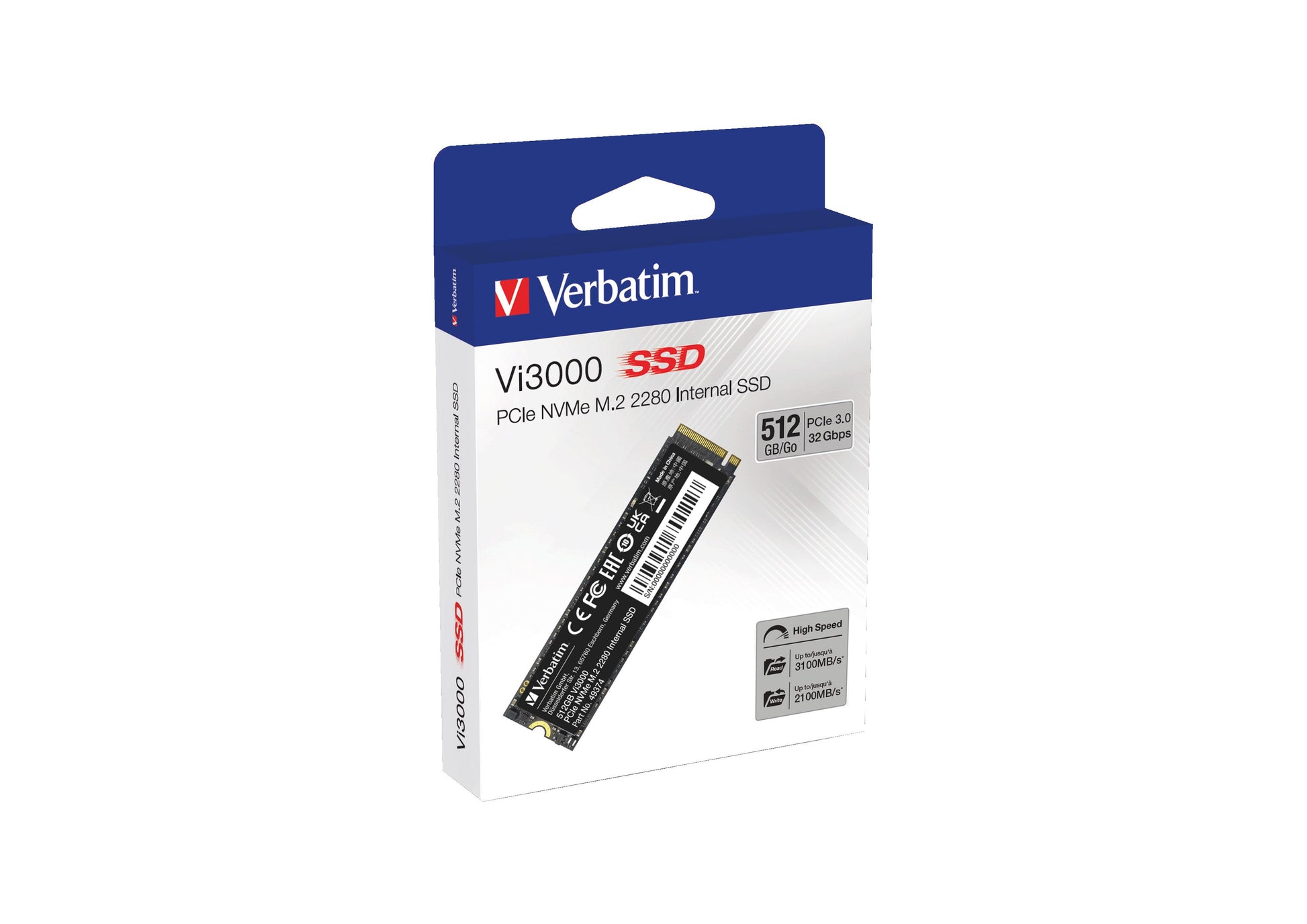 Verbatim Vi3000. Capacità SSD: 512 GB, Dimensione SSD: M.2, Velocità di lettura: 3100 MB/s, Velocità di scrittura: 2100 MB/s, Componente per: PC/PC portatile