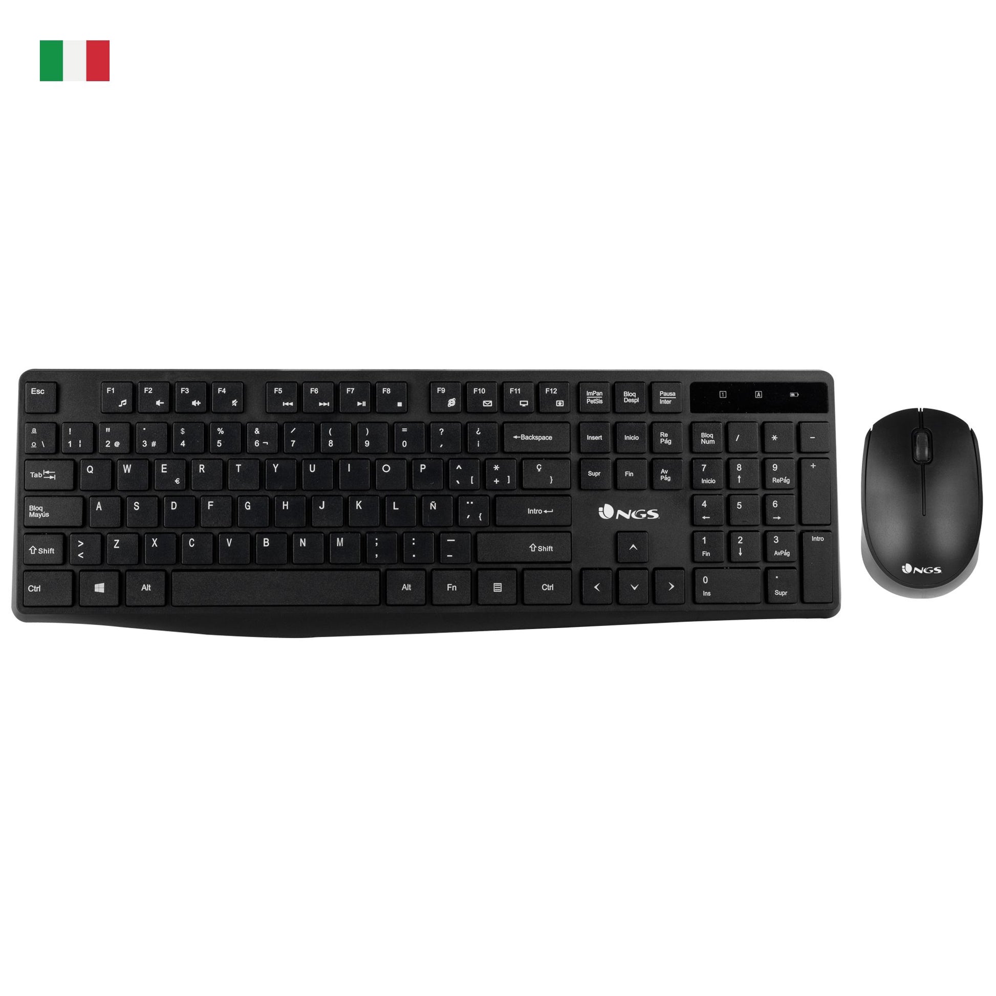 NGS Allure Kit (Italiano), QWERTY. Fattore di forma tastiera: Full-size (100%). Stile tastiera: Dritto. Tecnologia di connessione: Wireless, Interfaccia dispositivo: RF Wireless, Struttura tastiera: QWERTY, Utilizzo raccomandato: Universale. Colore del prodotto: Nero. Mouse incluso