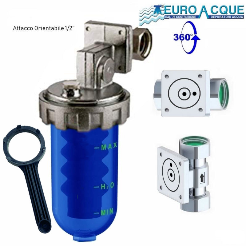 Questo addolcitore dosatore proporzionale di sali polifosfati 1/2' con calotte girevoli a 360° è ideale per caldaie, scaldabagni, lavatrici, lavastoviglie. Previene depositi di calcare ed evita la corrosione dei tubi. Include la chiave e la cartuccia