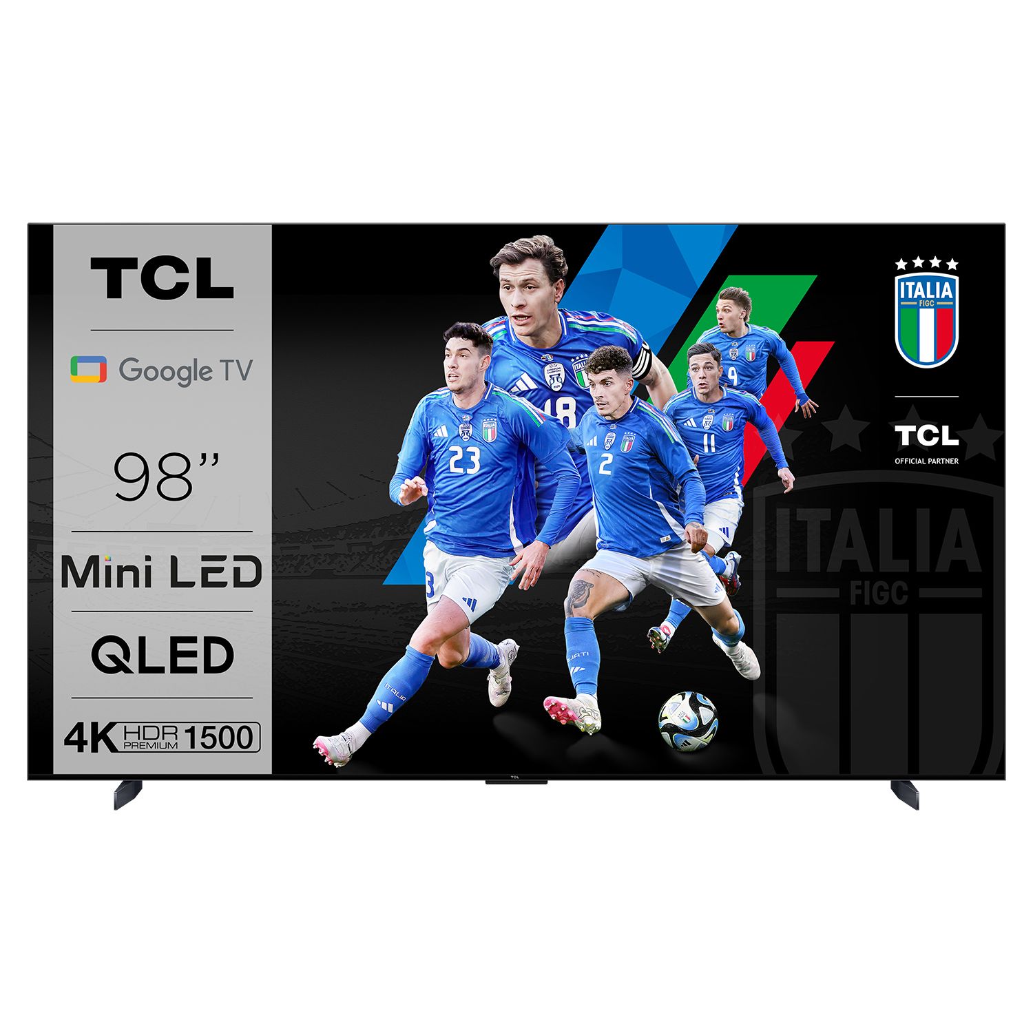 TCL C80 Serie Smart TV Mini LED 4K 98" 98C805, 144Hz, audio Onkyo con subwoofer, Google TV. Dimensioni diagonale schermo: 2,49 m (98"), Risoluzione del display: 3840 x 2160 Pixel, Tipologia HD: 4K Ultra HD, Tecnologia display: LED, Forma dello schermo: Piatto, Tipo di retroilluminazione LED: Mini LED. Smart TV. Tecnologia di interpolazione del movimento: PPI (Picture Perfomance Index) 4000, Luminosità schermo: 1500 cd/m², Tempo di risposta: 5,7 ms, Rapporto d'aspetto nativo: 16:9. Formato del segnale digitale: DVB-C, DVB-S2, DVB-T2. Wi-Fi, Collegamento ethernet LAN. Colore del prodotto: Nero