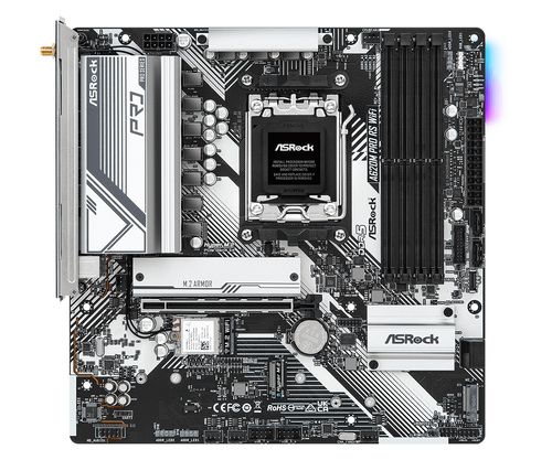 Asrock A620M Pro RS WiFi. Produttore processore: AMD, Presa per processore: Socket AM5, Processori compatibili: AMD Ryzen 7000 Series. Tipi di memoria supportati: DDR5-SDRAM, RAM massima supportata: 128 GB, tipo di slot di memoria: DIMM. Interfacce dell'unità di archiviazione supportate: M.2, SATA, Tipi di unità di archiviazione supportate: HDD & SSD, Livelli RAID: 0, 1, 10. Famiglia della scheda grafica: AMD, Adattatore grafico: AMD RDNA 2. Tipo di interfaccia Ethernet: Gigabit Ethernet, Controller LAN: Realtek 8111H, Wi-Fi standard: Wi-Fi 6E (802.11ax)