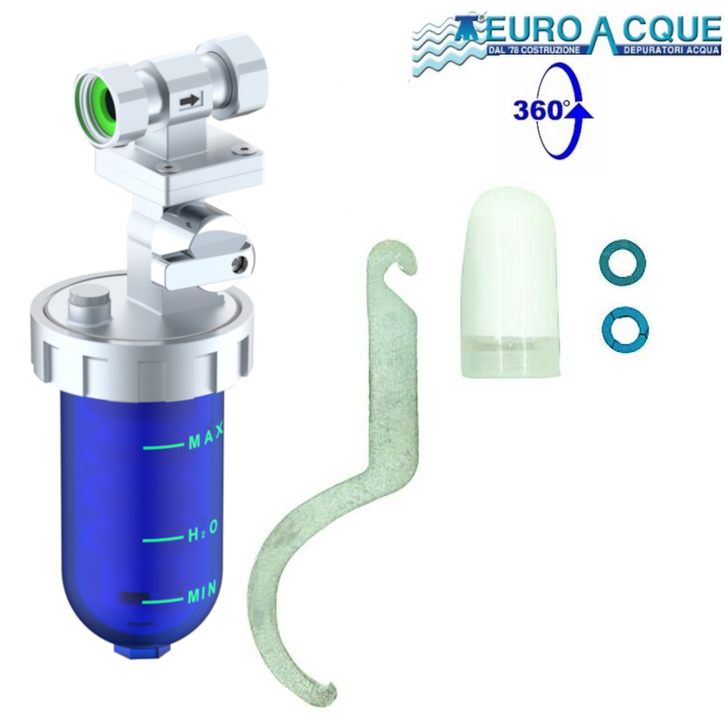 Questo addolcitore dosatore proporzionale di sali polifosfati 1/2' con calotte girevoli a 360° e valvola di by-pass è ideale per caldaie, scaldabagni, lavatrici, lavastoviglie. Previene depositi di calcare ed evita la corrosione dei tubi. Include la chiave e la cartuccia