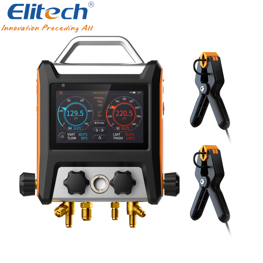 Il manometro intelligente Elitech serie MS integra misurazione di pressione e temperatura, mantenimento pressione, vuoto, peso del refrigerante e registrazione dati, perfetto per manutenzione quotidiana HVAC/R. Supporta app Elitech Tools per gestione da smartphone, test di ciò, touchscreen intelligente da 5" con registrazione fino a 100?000 dati e calcolo automatico di surriscaldamento e sottoraffreddamento su 88 refrigeranti. La valvola a 4 vie e la modalità pompa di calore automatica semplificano l�uso senza cambiare tubi refrigeranti.