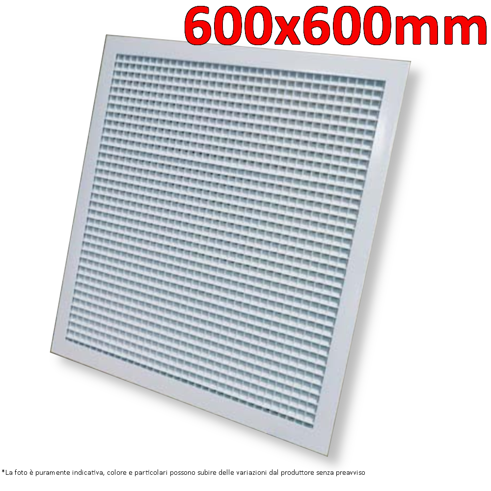 Bocchetta di ripresa porta-filtro in alluminio colore bianco griglia a quadri. Filtrina inclusa (spessore 10 mm, efficienza G3). Dimensioni 600x600 mm.