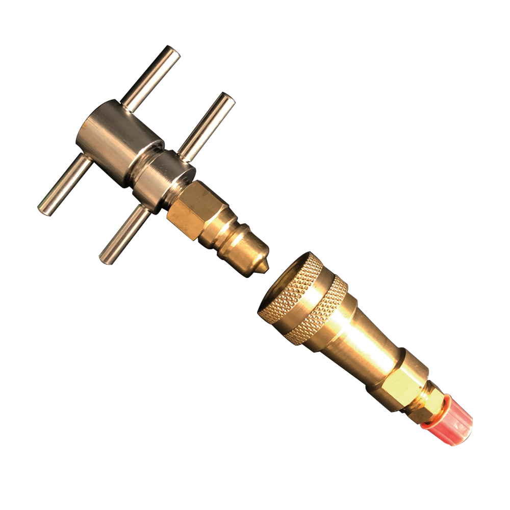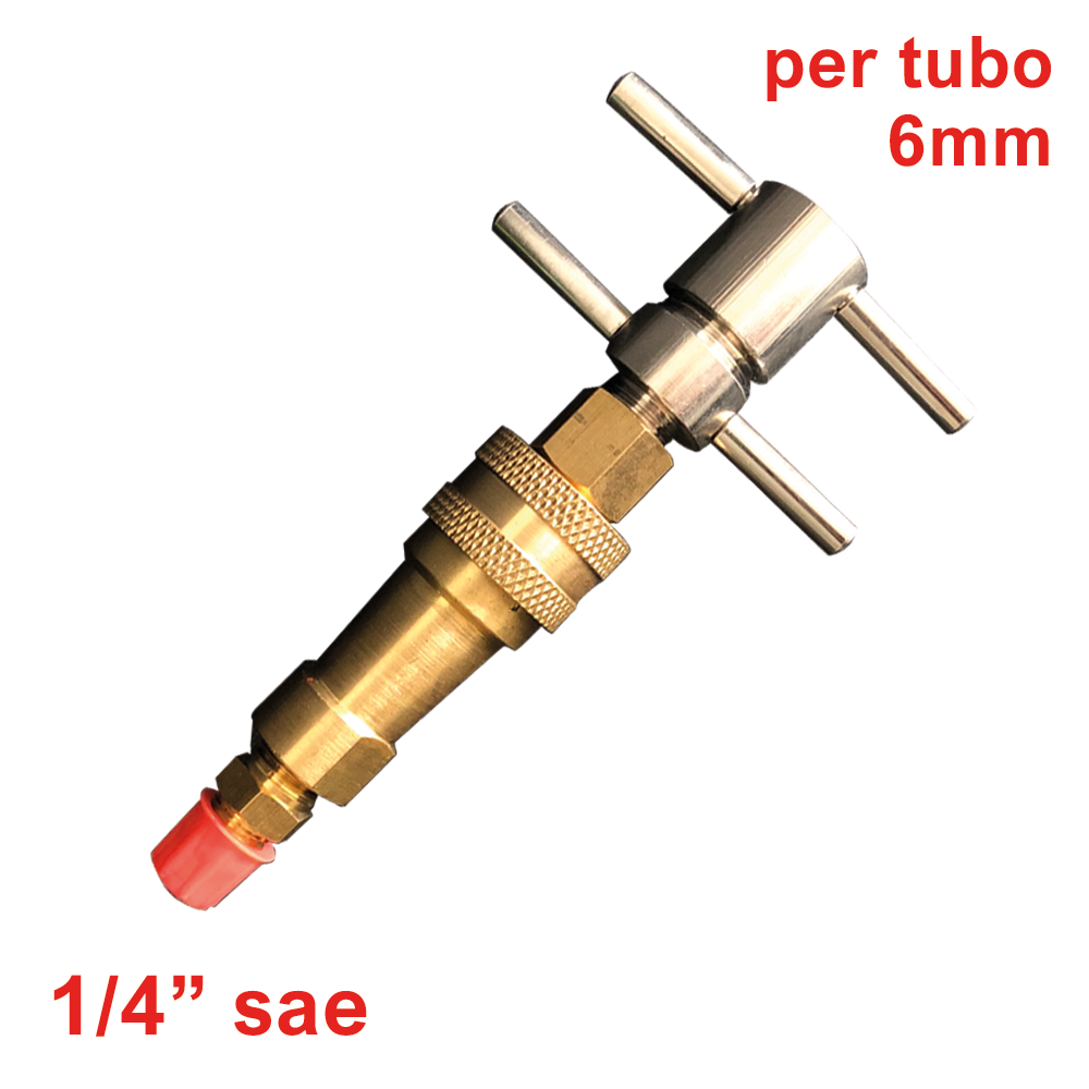 Questo giunto a farfalla consente il collegamento su tubi in rame da 6 mm ed 1/4'' di compressori per poter effettuare tutte le operazioni di carica, vuoto e manutenzione. Il giunto a farfalla dispone di una uscita con filetto maschio 1/4'' Sae.