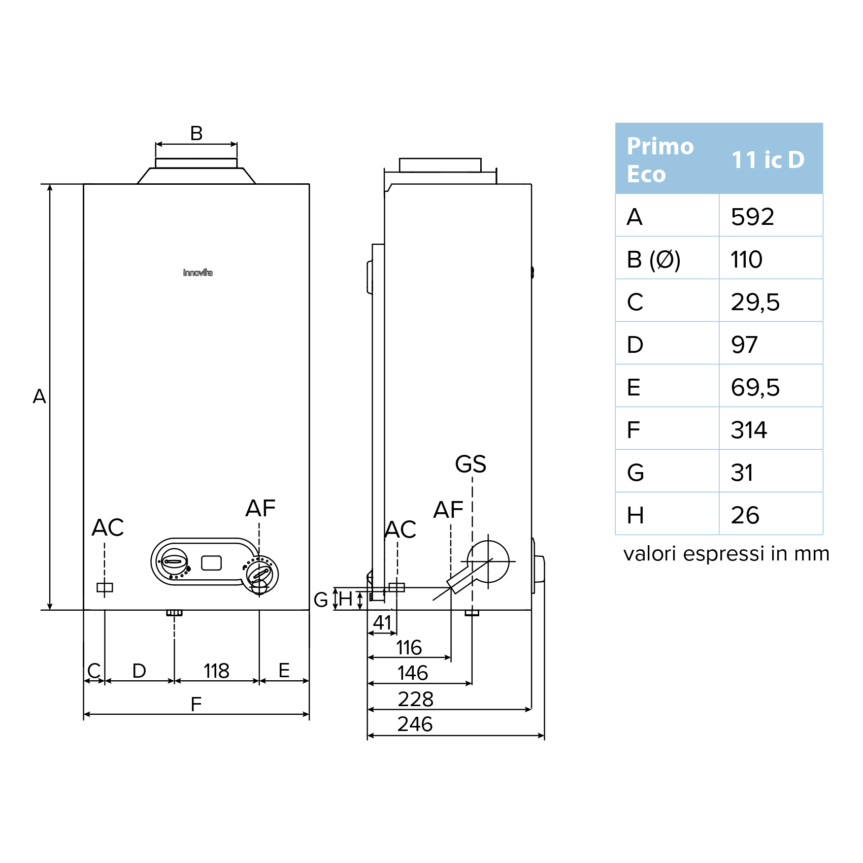 INNOVITA PRIMO ECO 11 ic D - Scaldabagno a Metano istantaneo 11 Lt Low NOx a gas a camera aperta - accensione ionizzata