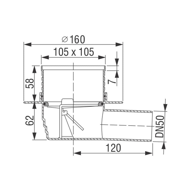 Piletta di scarico da pavimento, griglia 105x105 mm, valvola di non ritorno