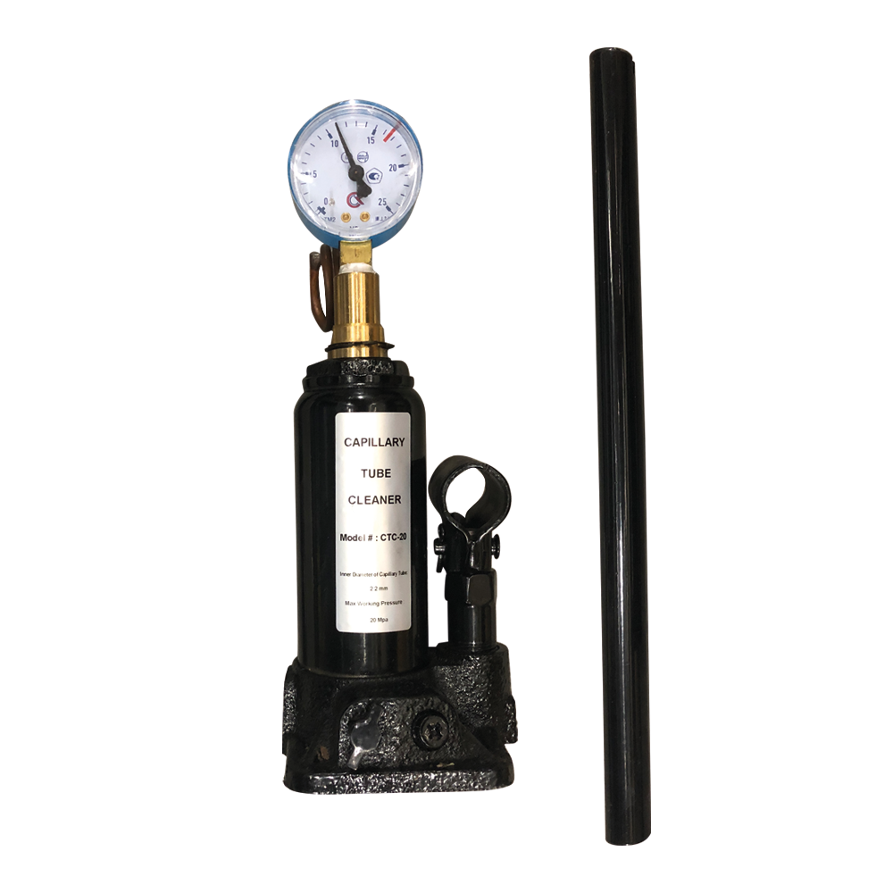 Pompa idraulica portatile per la pulizia e lo sblocco di capillari o tubazioni in rame. Particolarmente adatto a circuiti refrigerati. Dotata di un manometro 0/250 Bar (0/25 Mpa) che mostra l'accumulo di pressione nella pompa.