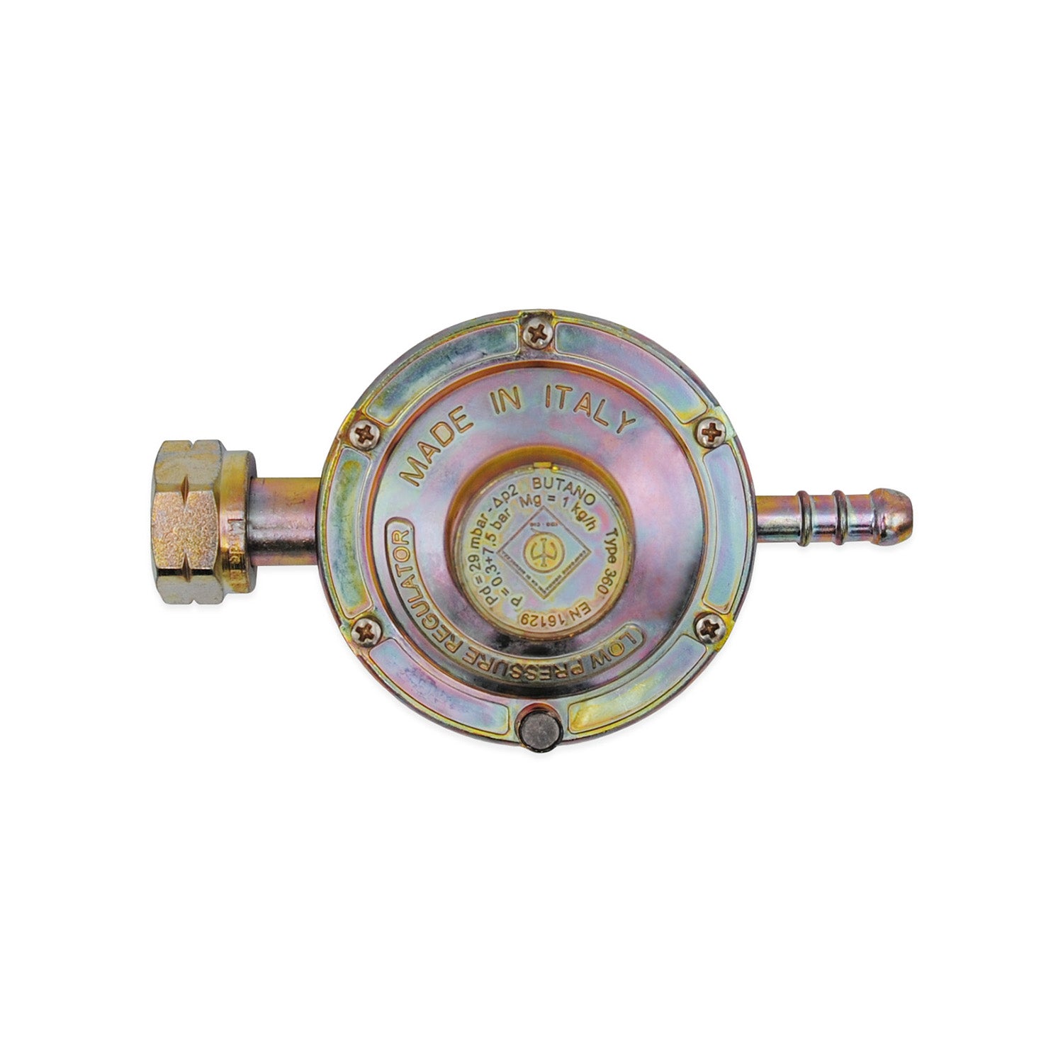 Regolatore di pressione GPL ad uso domestico Taratura fissa 1,1 Kg/h - uscita portagomma