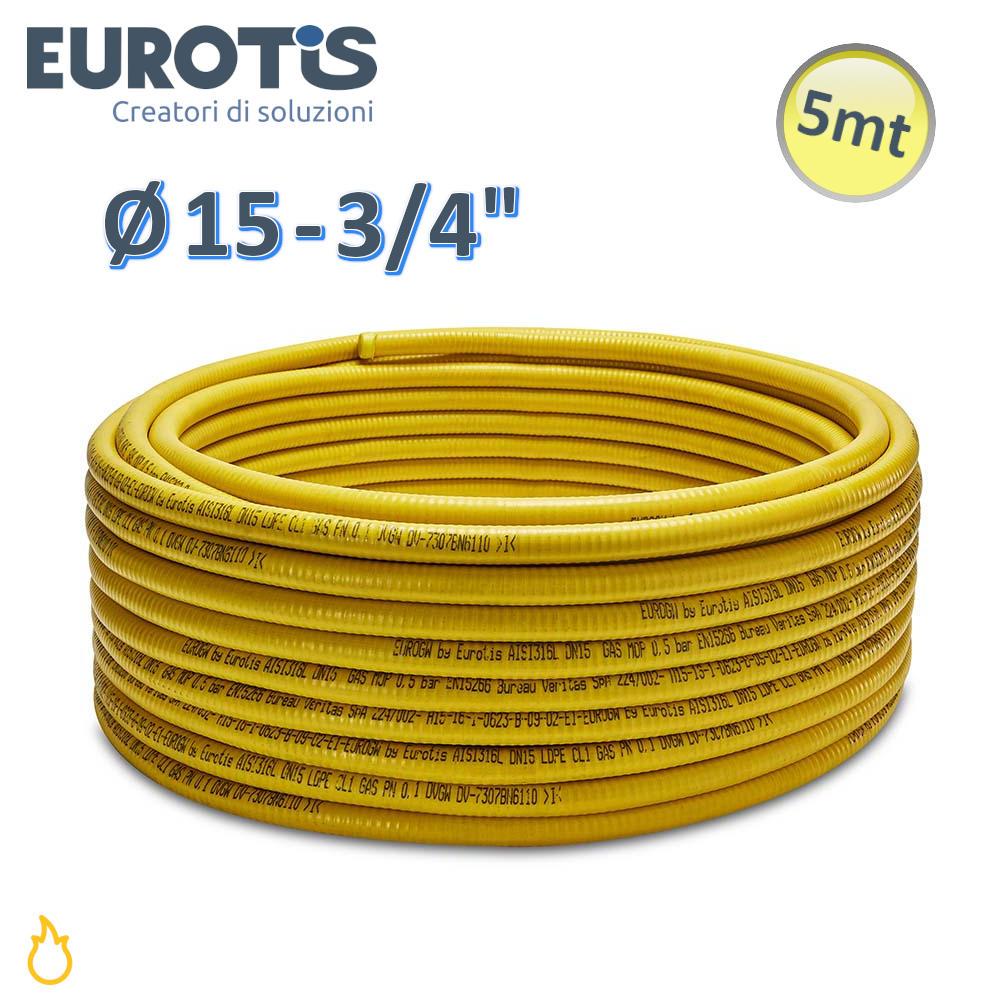 Tubo corrugato ? 15 - 3/4'' - 0,30 mm - 5 mt formabile giallo CSST in acciaio inox per gas in LDPE - Eurotis